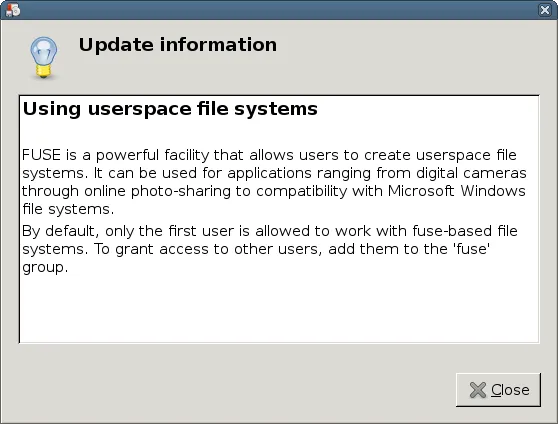 This dialog gets points for being graphical, and loses many, many, many points for presenting no information that any reasonable user could possibly get any use from unless they already previously understand (1) what FUSE is (2) how to get FUSE plugins (3) who the ‘first user’ is (4) what the ‘fuse group’ is and (5) how to add users to the ‘fuse group.’ And if you know all those things, you didn’t need the dialog, so kudos for being both useless and intimidating.