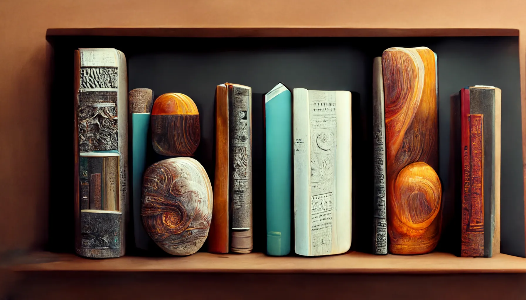 “An interesting bookshelf photorealistic”, as rendered by Midjourney’s image-creation AI, another summer hobby.